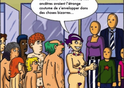 Il vit tout habillé et se promène ainsi partout, alors qu’il vit dans un monde naturiste 🙂